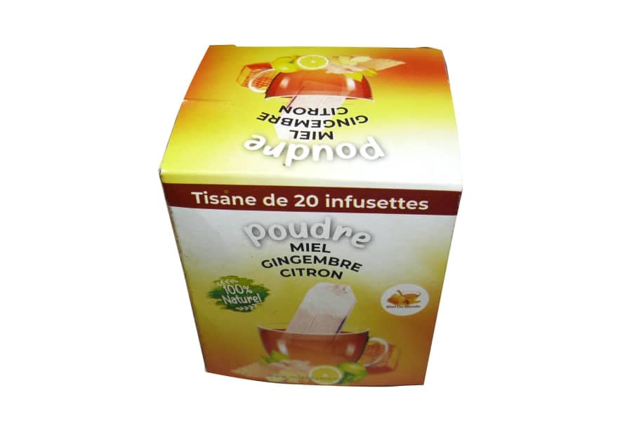 ![]() | Boite poudre miel, gingembre et citron | 400 G | 4000 FCFA | Carton de 24 pièces |